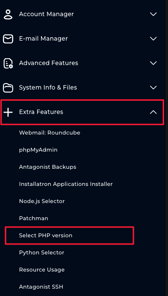 - Within the menu, go to 'Extra Functions' and then 'Select PHP version'.