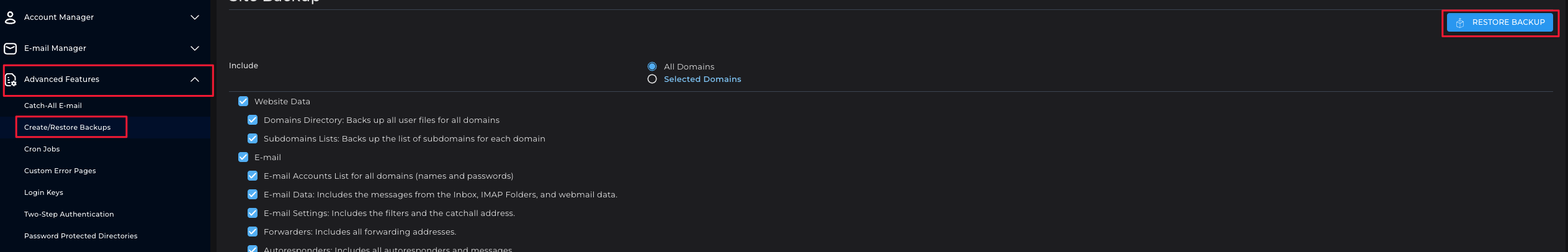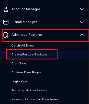 2. Within the menu, go to 'Advanced Features' and then 'Create/Restore backups'.