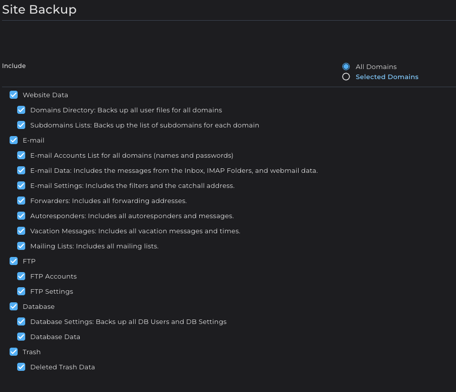 | Domain folders | all files which can be found under the folder 'Domains' within the File manager of DirectAdmin |