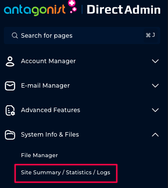 - Within the menu, go to 'Systeminfo and files' and then click on 'Site Summary / Statistics / Logs'.